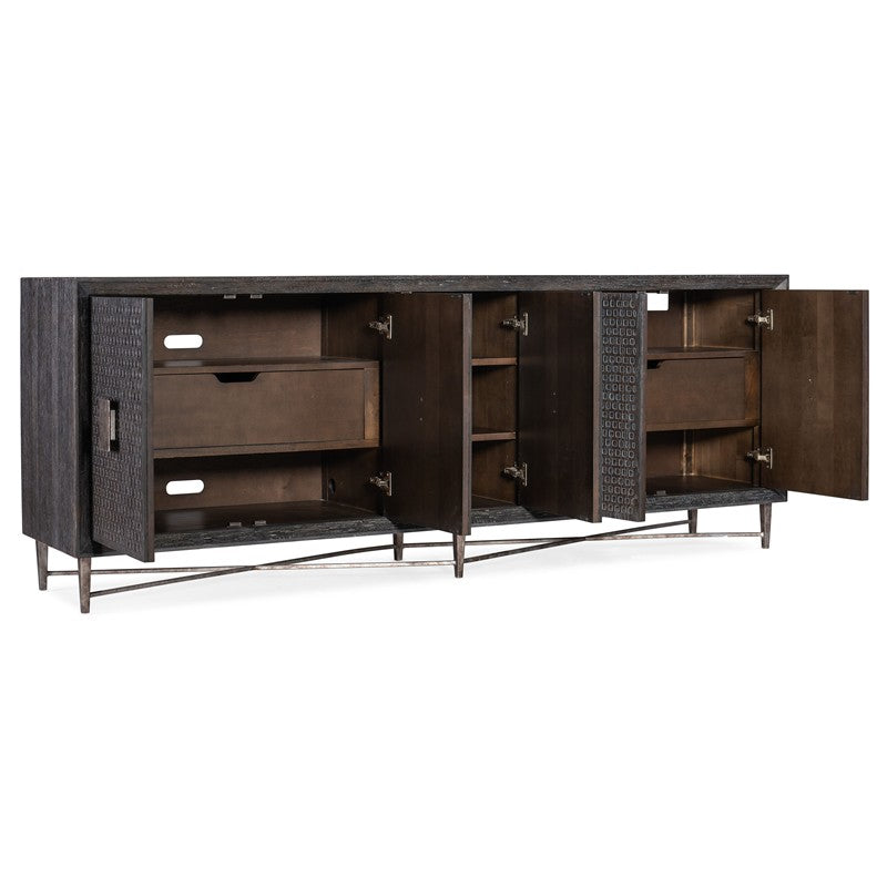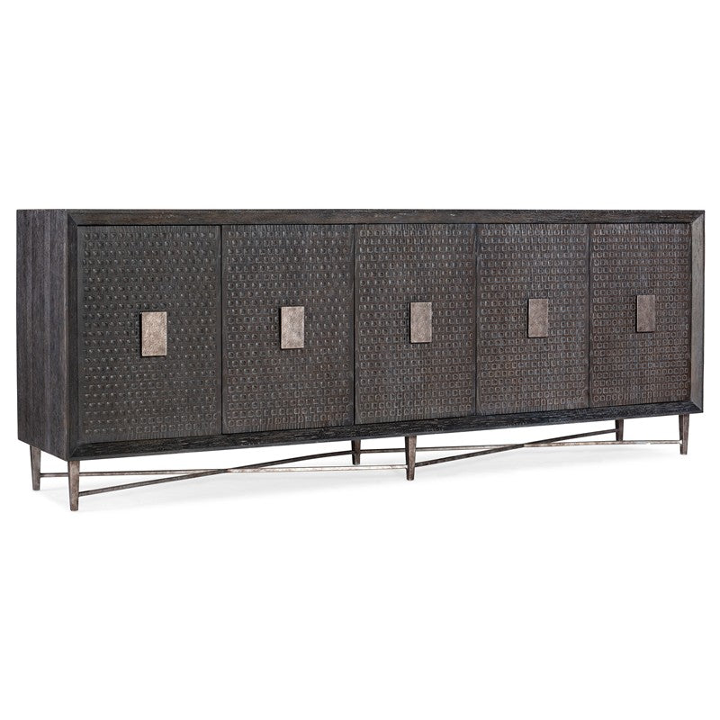 An unexpected eclectic blending of texture, form and function with an understated and timeless beauty, the Mélange Keenan Five-Door Credenza combines a weave-like tactile surface with a shaped silver metal base and distressed metal hardware in an oversized rectangle shape. There’s one drawer behind the pair of left doors, creating one shelf, and one drawer behind the pair of right doors, creating one shelf, and two adjustable shelves behind the center door. Crafted of Oak Veneers, resin and metal, there’s a ventilated back panel and wire management holes in the back panel.
