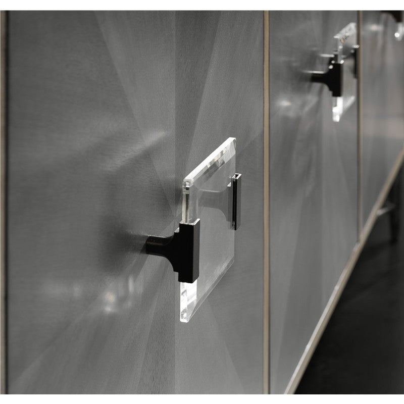 With its cosmopolitan flair and exquisite style, the Zola would be at home in a shop on Rodeo Drive – or in your living space. Crafted of Elm, Maple and Black Walnut, the case is finished in a natural color, while the front features a diamond pattern in contrasting gray tones, accented by jewelry-like Lucite pulls. A refined metal base in a silver finish creates the finishing touch. Four doors with soft-closing hinges, with one adjustable shelf behind both the center set of doors and the left and right doors.