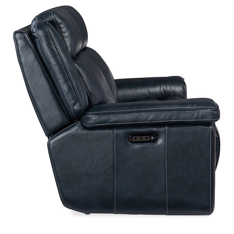 Chunky and comfy in the chic Cosmos Cobalt finished top-grain leather, the Montel Power Recline Loveseat has it all: smooth reclining motion to the lay-flat position, a power headrest, adjustable lumbar support and a USB port. Tailoring details include a bustle-style back and decorative top stitching.