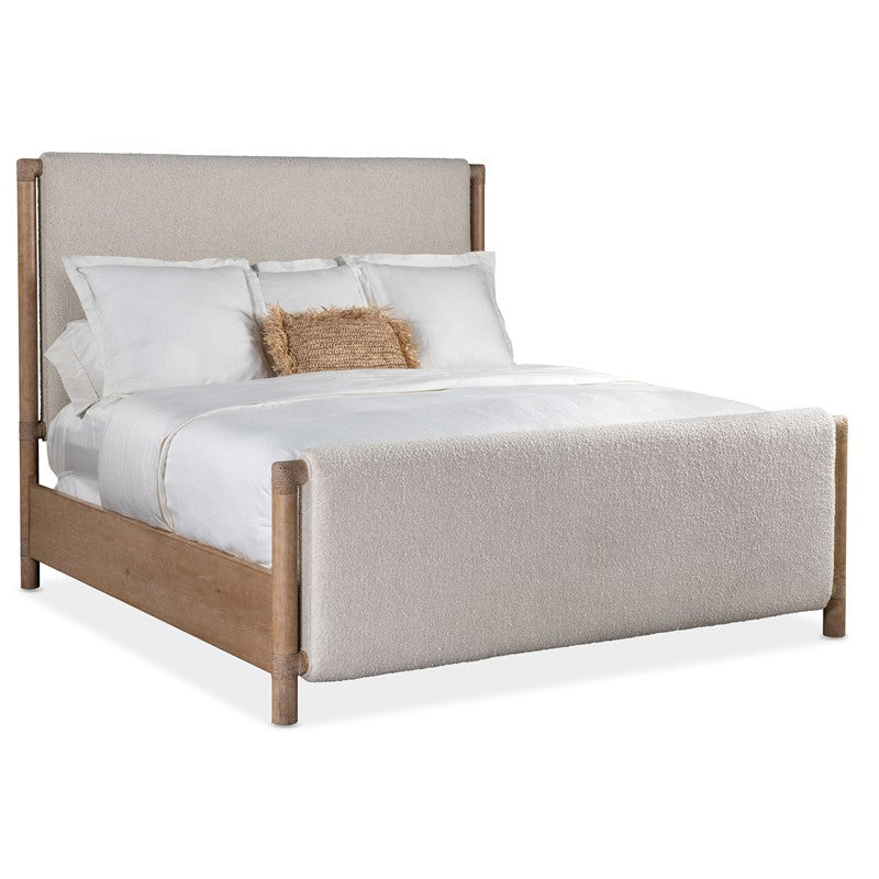 Exuding a tropical-retreat-inspired vibe with organic details such as rope accents, this dramatic pole-cane poster bed is a focal point piece to build your space around. The Dune finish showcases the unique grain patterns of the wood and is as light as sand and smooth as a shore after the receding tide. Upholstered in a the cozy Neo Cream fabric. Includes the headboard, footboard and rails.