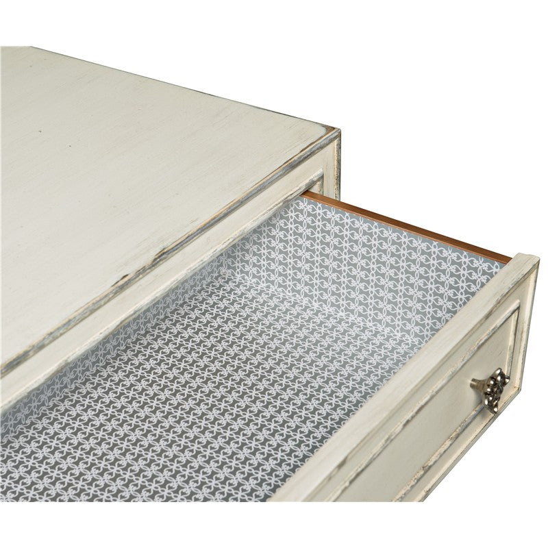 Just add candlelight. With clean lines and a creamy white finish accented with champagne and silver tipping, the Anastasie Dresser is refined elegance with a whisper of Hollywood glamour. As practical as it is pretty, the nine-drawer dresser has a top center drawer with a drop front and a right top drawer with a drop-in felt-lined jewelry tray. The bottom 3 drawers are cedar-lined, and the top 3 drawers are lined with gray and white designer wallpaper.