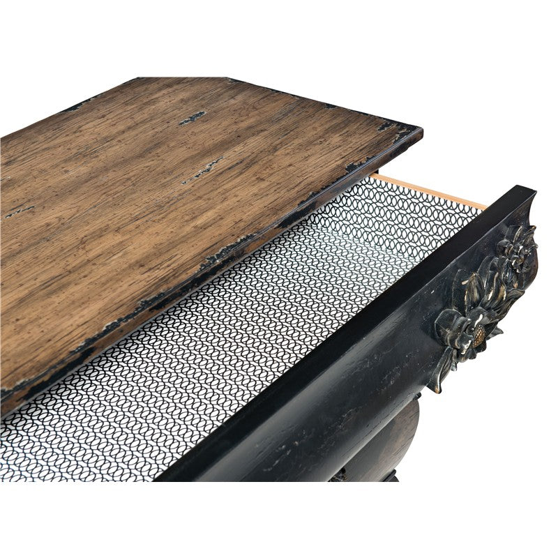 With the look of a cherished heirloom that is been passed down for generations, the Charmant Bachelorette Chest exudes an enchanting feeling that will add magic to your home. The random floral design that graces the front is carved for a dimensional feel. The Porte Noir finish is a black paint with rich brown undertones, rubbed to a medium sheen with areas of heavy rub through and distressing to reveal a honey tone wood color. Three drawers. The top drawer is lined in black and white designer wallpaper. Functional as well as pretty, the piece includes a power supply, and a light underneath with 3-intensity touch switch.