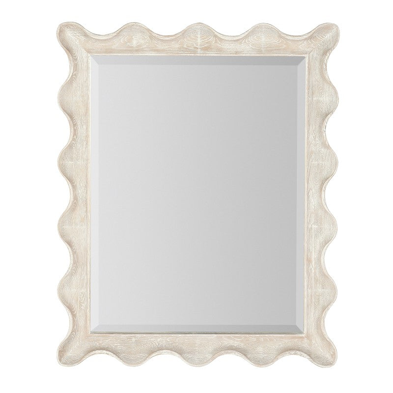 ring the relaxed aura of the outside in with the lovely scalloped-edge Bora Landscape Mirror in the refreshing Surf finish, an airy whitewashed oak with wire-brushing detail.