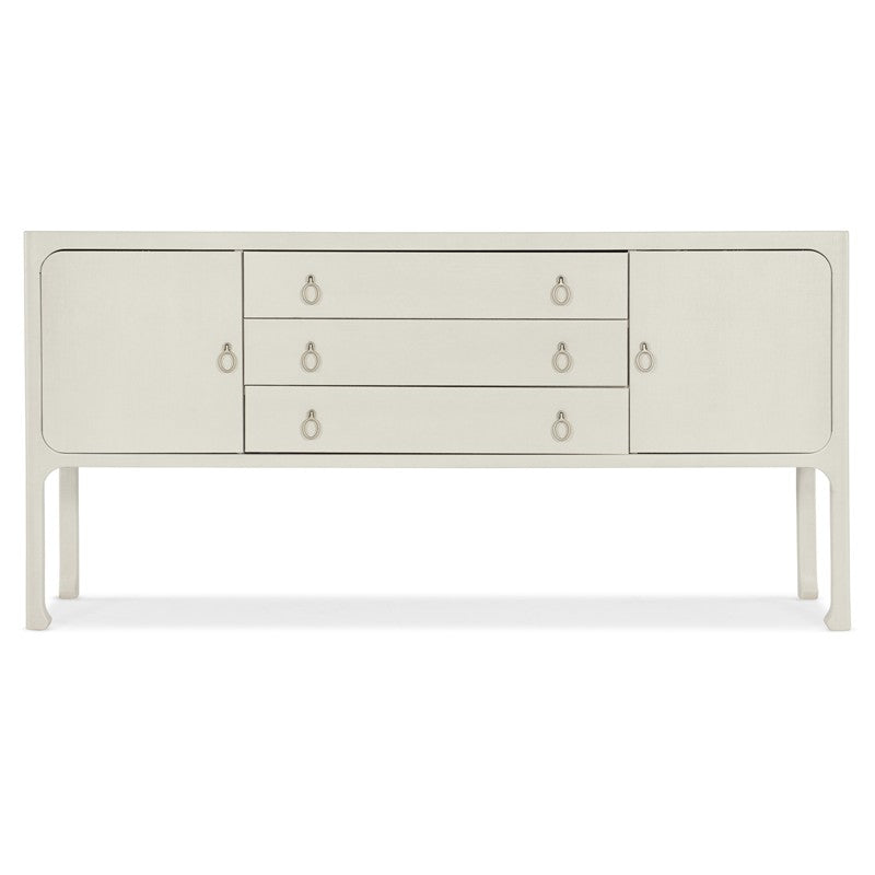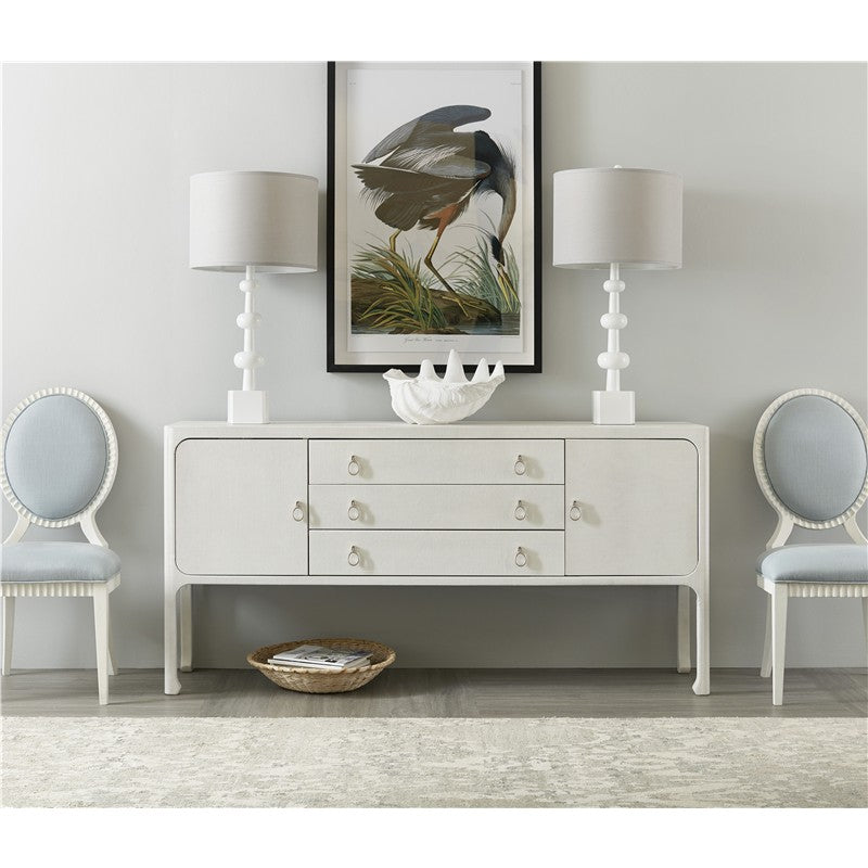 Create a comfortable and inviting retreat within your home with the Cove Shore Server, a piece that will help you extend hospitality with ease and grace. Crafted of wood and raffia, it is offered in the white lacquered grasscloth Sand Dollar finish with light champagne decorative pulls and chow legs giving a designer touch. There are 2 soft-close doors and one adjustable shelf behind each door. Three drawers with soft-close drawer guides. The top drawer has a removable black felt liner and removable black silverware tray.