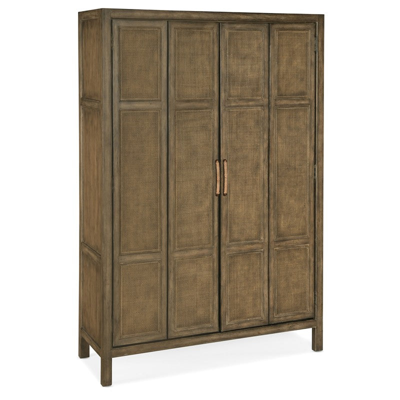 Escape the stress and extend hospitality to others with the resort-inspired Sundance Bar Cabinet, featuring two bi-fold rattan doors, four drawers with self-closing drawer guides, two pull-out work surfaces, four pull-out wine shelves and eight stemware racks. Crafted of Pecan Veneers, Rattan and glass, the bar cabinet is finished in Cliffside, a rich, dynamic brown finish with light burnishing on the edges. Lights are activated by a three-intensity touch switch.
