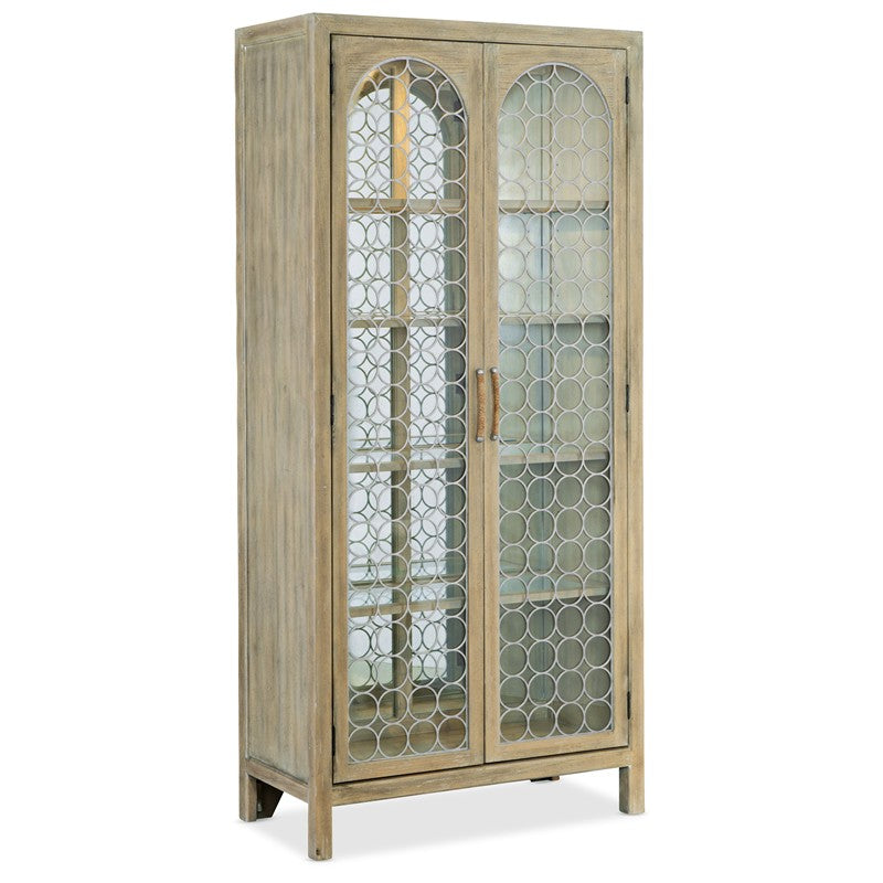 Create a calming resort-inspired retreat in your home with the focal-point-worthy Surfrider Display Cabinet. The circular patterned metal fretwork over tempered glass on the door fronts is a designer detail, along with an antique mirror back panel. Behind the doors are 4 adjustable wood-framed glass shelves illuminated by a 3-intensity touch switch. Crafted of Pecan Veneers, the cabinet is finished in the light natural Driftwood with distressing including sandblasting and bleaching.
