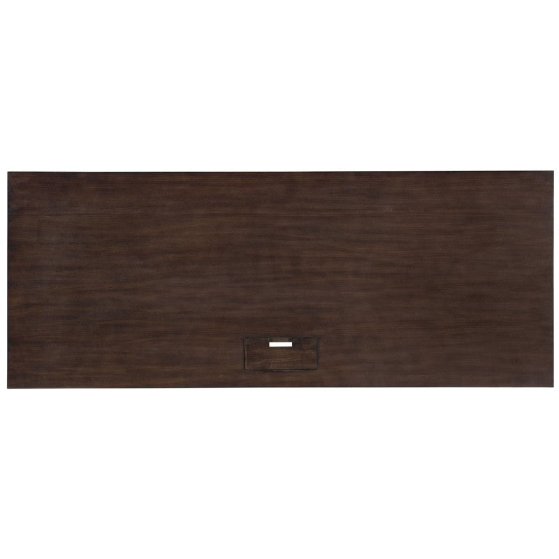 Add stylish work-from-home bandwidth to any space with the House Blend 60in Writing Desk with a sleek combination of the Dark Roast finish over Quartered Ash Veneers and silver metal trim. The bold silhouette is finished on all sides and features a power supply in the top for seamless electronics hook ups.