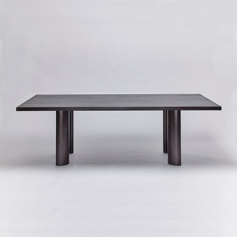 Juxtaposing a rectangular surface with rounded oval legs, the oak Auburn Dining Table adds sophisticated drama to any meal thanks to its rich coffee finish and bold size.