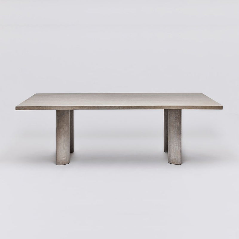 Juxtaposing a rectangular surface with rounded oval legs, the oak Auburn Dining Table adds sophistication to any meal thanks to its cliffside grey finish and bold size.