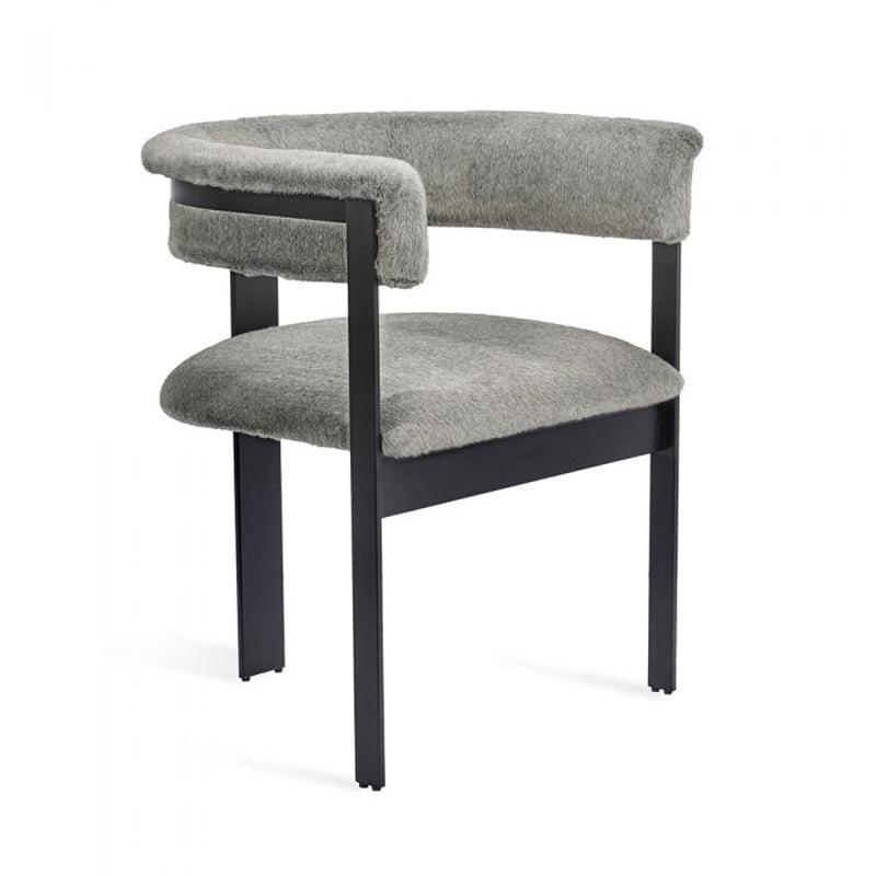 Boasting an art moderne influence, the Darcy Dining Chair juxtaposes a luxe cashmere pewter seat with a streamlined stainless steel frame in a matte black finish.