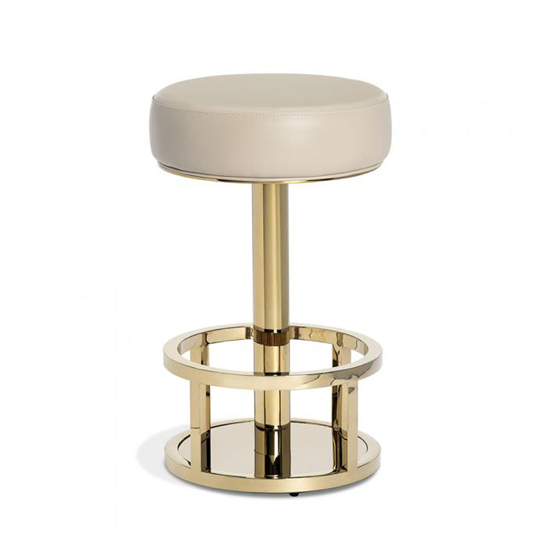 Topped in cream latte faux leather, the polished brass-finished Drake Counter Stool brings together a retro silhouette with an industrial edge, plus the fun of a swivel.