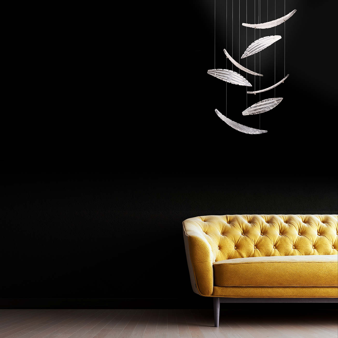 Elevate raises your environment to new heights. Each "plume" is handblown and sculpted with a translucent mixture of clear crystal and white glass. Illuminated from a silver leaf canopy and suspended by adjustable cables, this Made in America round fixture features 7 handblown glass "plume" and is ideal for low ceilings.