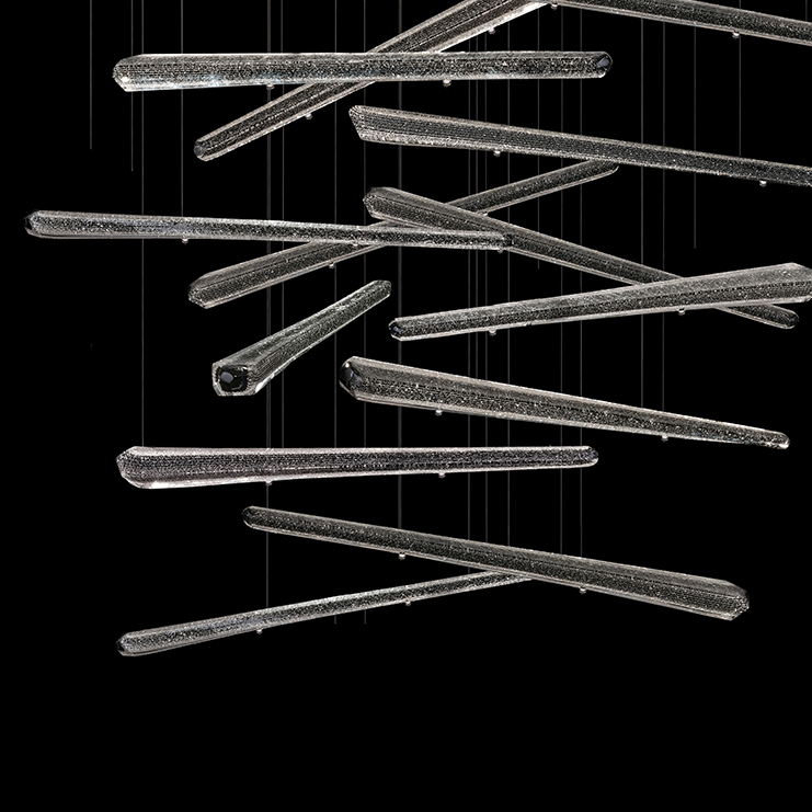 Elevate raises your environment to new heights. Each glass spire is hand sculpted with solid ebony crystal and surrounded by a clear crystal casing. Illuminated from a soft gold leaf canopy and suspended by adjustable cables, this Made in America round fixture features 17 sculpted spires and is ideal for low ceilings.