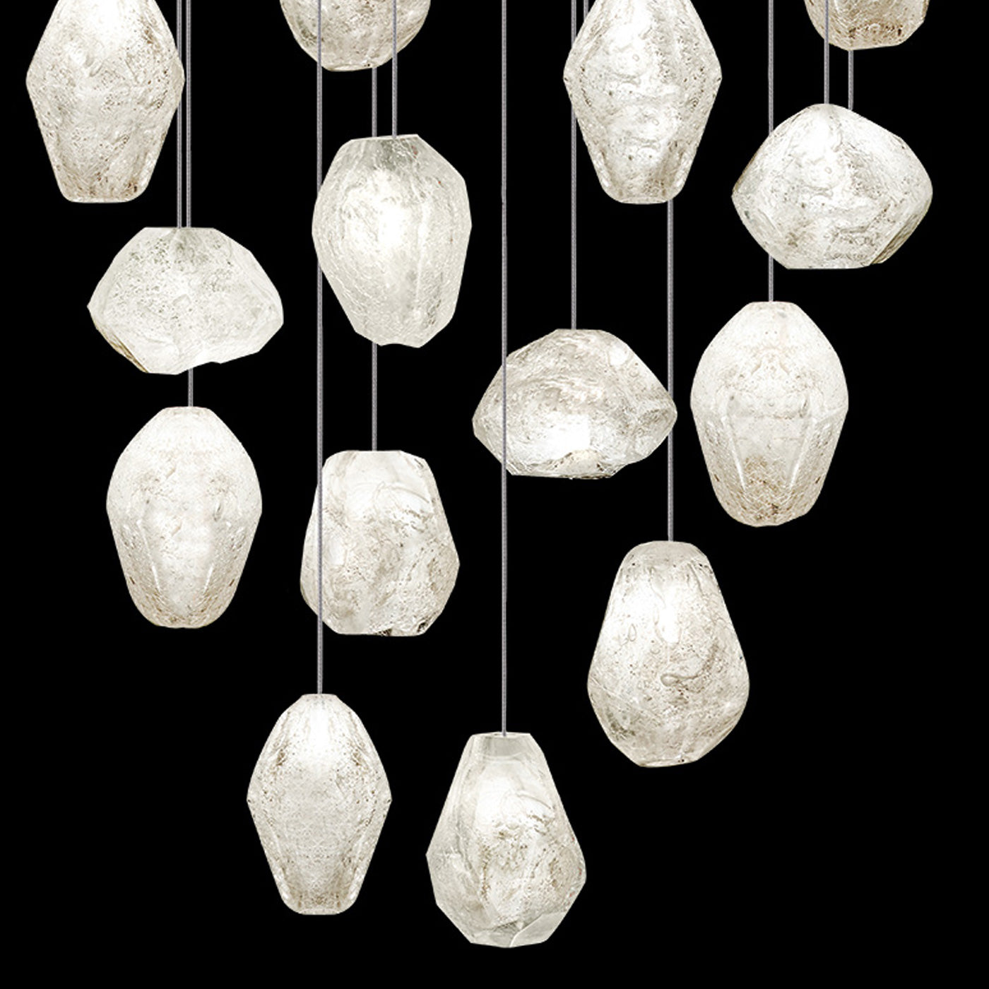Master glass artisans blend quartz with other minerals to create Clear Quartz glass drop pendant with gold-toned silver leaf canopy. Also available in platinized silver leaf with choice of additional crystal glass options. For 220V, item is configured with halogen G4 bulb(s).