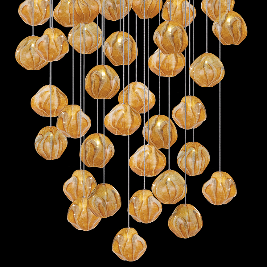 Inspired by one of the largest asteroids in our solar system that continuously orbits the outer reaches of space. Its rocky form has been punished over billions of years since the early formation of our planets. Our glass artisans have recreated this celestial form using a unique technique of freehand glassblowing that creates a ghostlike illumination through the amber colored glass. Each handblown, sculptural piece is a unique work of contemporary art hanging from a soft gold leaf canopy. Approximate blown glass drop dimensions: 5.5"W x 6.5"H.