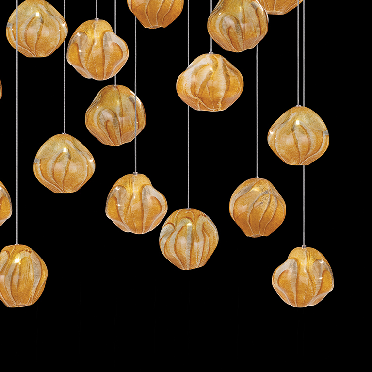 Inspired by one of the largest asteroids in our solar system that continuously orbits the outer reaches of space. Its rocky form has been punished over billions of years since the early formation of our planets. Our glass artisans have recreated this celestial form using a unique technique of freehand glassblowing that creates a ghostlike illumination through the amber colored glass. Each handblown, sculptural piece is a unique work of contemporary art hanging from a soft gold leaf canopy. Approximate blown glass drop dimensions: 5.5"W x 6.5"H.