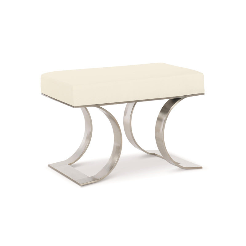 An elegant and inviting bench featuring a gleaming stainless steel frame with curved, open end panels.