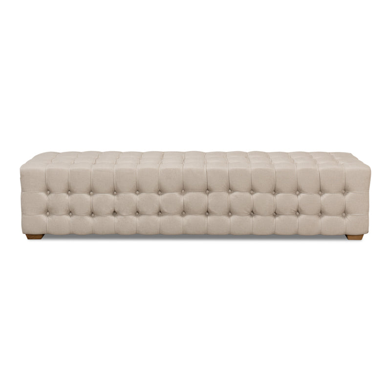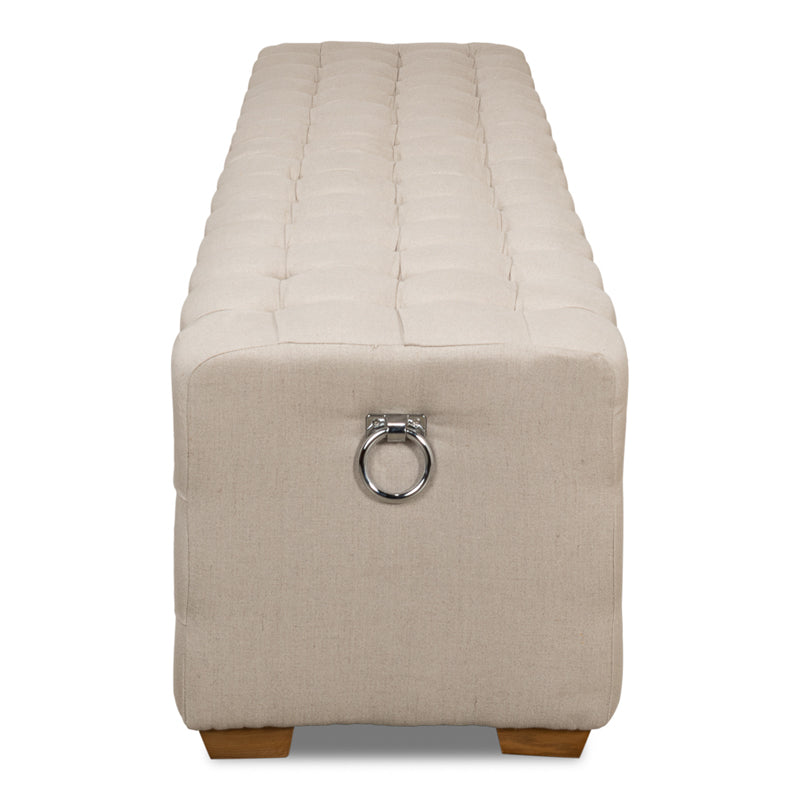There's tufting all around on this long bench. The ring handles on either end add another very nice touch. It will be useful at a large dining table or in the foyer.