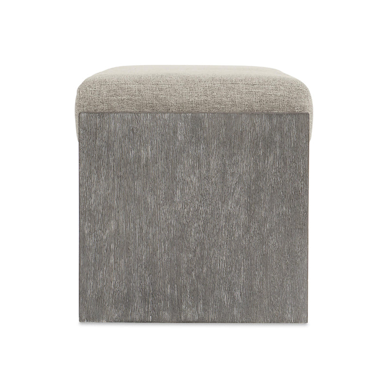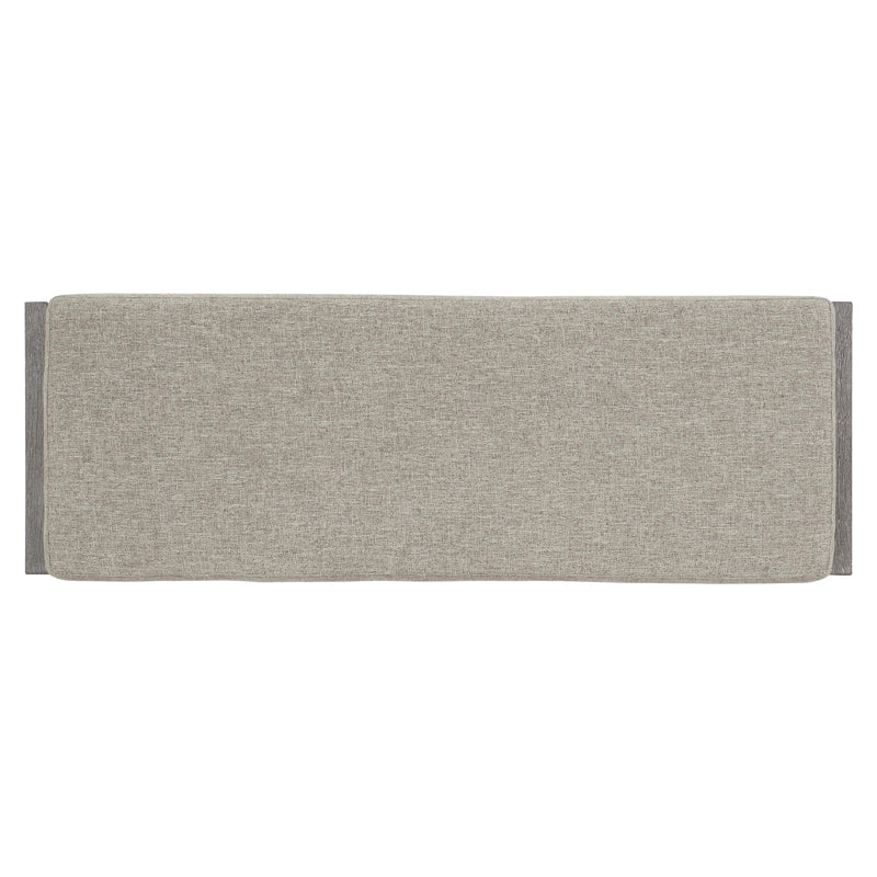 Woven textile blends with cerused, wire-brushed acacia in this perfectly balanced, rustic modern bench.