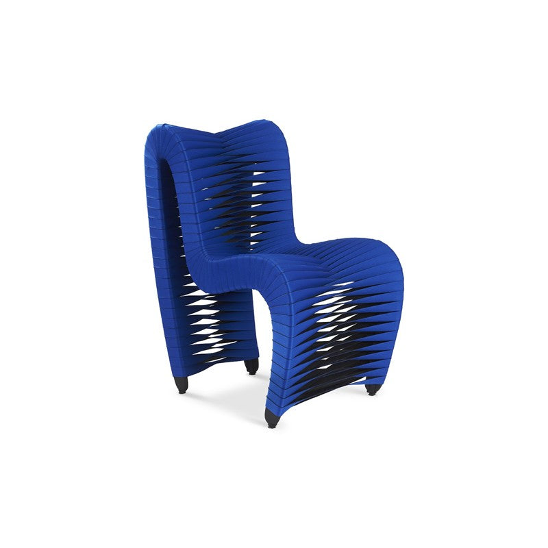 The Seat Belt Blue Dining Chair is one of many offerings in this contemporary seating collection by award-winning Thai designer Nuttapong Charoenkitivarakorn. The design was inspired by the intertwining spools of fabric seen when visiting a seat belt factory. Nuttapong’s striking chairs are easily recognizable by the braided backside and stiletto profile. The straps are woven on a frame made of wood that is reinforced with metal. There are monochromatic and two-toned versions, each of which are available in many colors. We offer custom color matching for quantities of 16 or more. All of these reflect the ethos that the Phillips Collection personifies: modern organic.