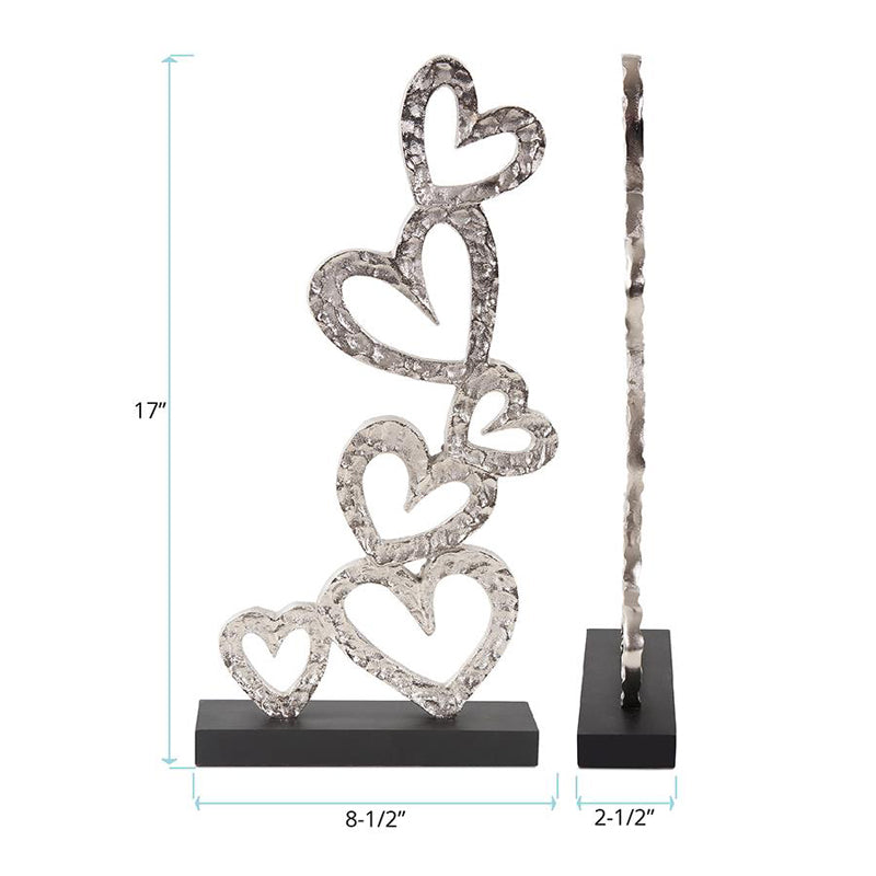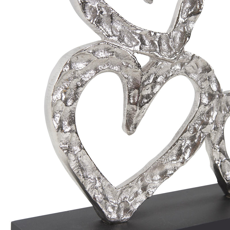 Cast in aluminum, with the look of being hand forged, each heart is finished in a polished silver and mounted on a black base. This sculpture can signify the love in all of us. Sculpture