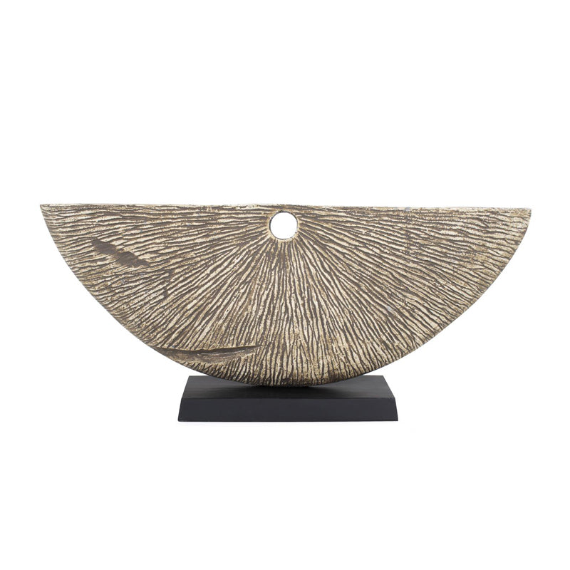 A sculpture with the amazing texture and finish of The Hubert will definitely take center stage in any room decor from modern to traditional. This one sided cast aluminum piece is mounted on a wooden base finished in matte ebony. The hand rubbed antique silver finish gives the overall design a depth and structure unlike any others. The shallow depth of The Hubert sculpture allows for it to be placed prominently on a mantel or shelf. Sculpture