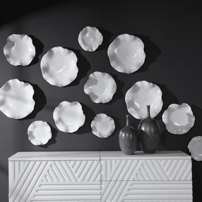 A Trio Of Ceramic Flowers With Detailed Veining, Glazed In A Fresh White Tone. May Be Hung On Wall Or Used As Tabletop Accessory. Safe For Outdoor Use, But Protection From Freezing Temperatures Is Recommended. Sizes: Sm-11x3x11, Med-15x3x15, Lg-18x4x18