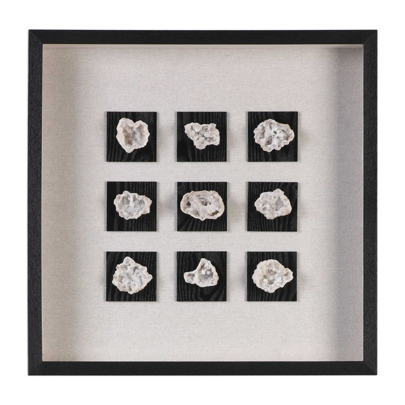 Authentic Geodes In Natural Hues Are Displayed On Black Woodgrain Matting Atop A Natural Linen Mat. A Black, Fir Wood Shadow Box Frame Completes The Display. Sizes And Shapes Of Geodes May Vary Slightly.