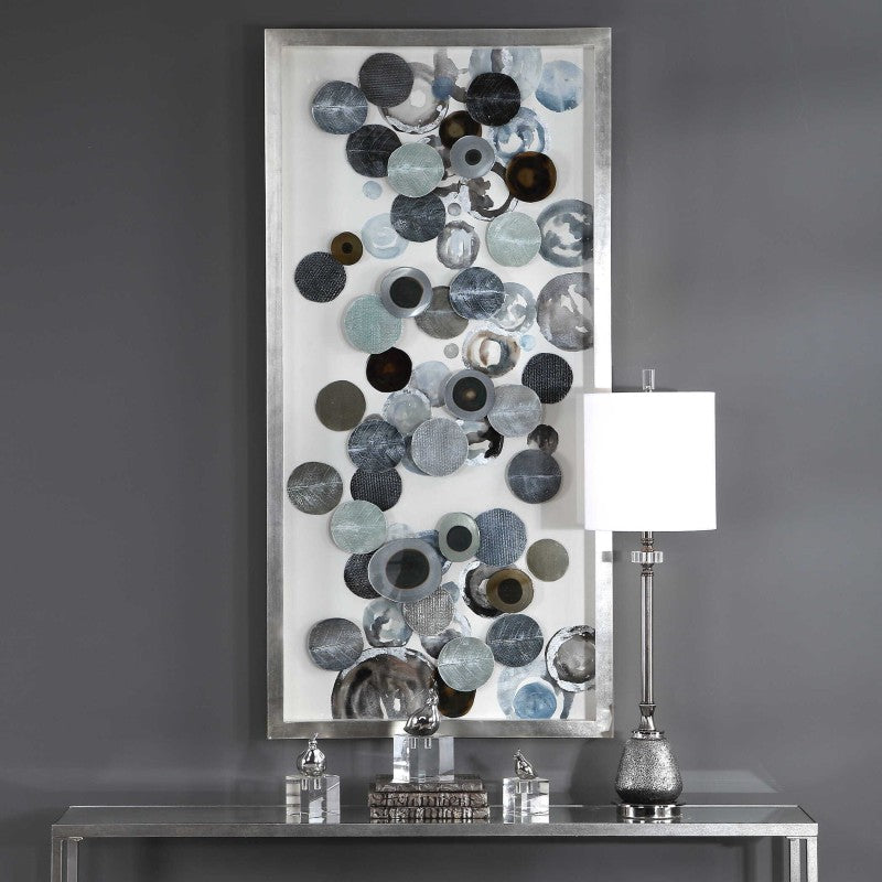 Abstract In Design, This Art Features Overlapping, Blow Torched Iron Discs With Hand Painted Acrylic Accents In Tones Of Silver, Brown, Blue, And Green. The Art Is Under Glass And Is Encased By A Lightly Antiqued Silver Leaf Shadow Box. May Be Hung Horizontal Or Vertical.
