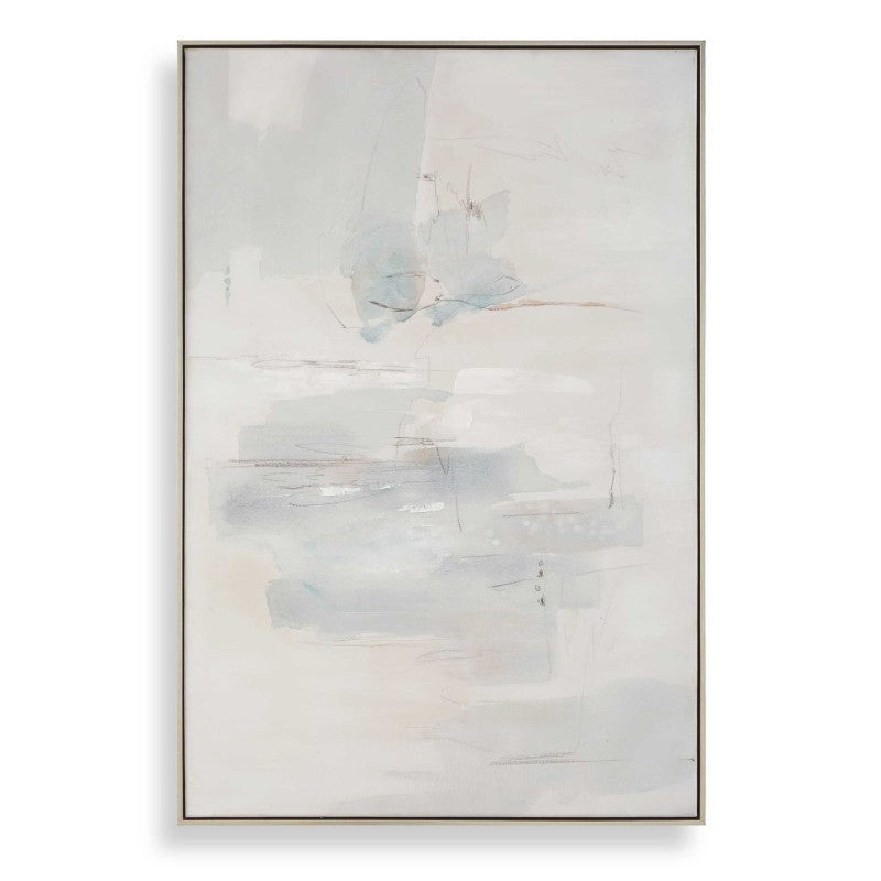 In This Hand Painted Abstract, Light, Airy Shades Of Gray And Sand Gently Merge With Cool Blue Undertones, Enhanced By Intricate Fine Pencil Drawings. Encased In A Sophisticated Champagne Finish. Due To The Handcrafted Nature Of This Work, Each Piece May Have Subtle Differences. A May Be Hung Horizontal Or Vertical.