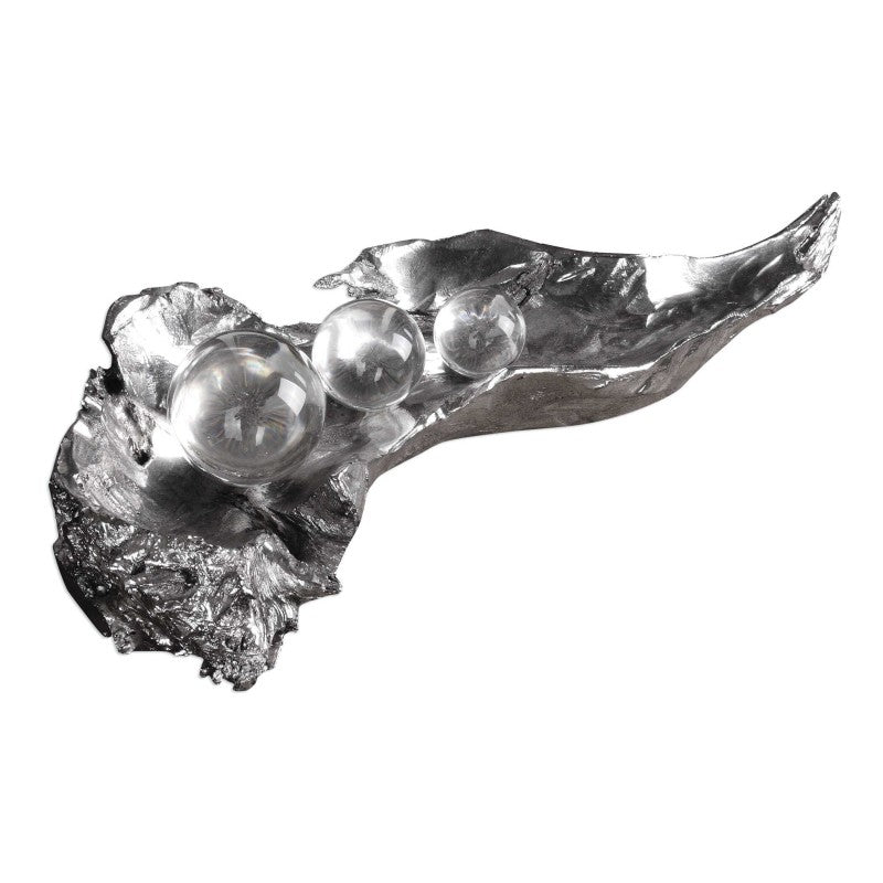This Gorgeous Sculpture Simulates Peas Sitting On An Open Pod, Finished In A Tarnished, Metallic Silver With Clear Crystal Spheres.