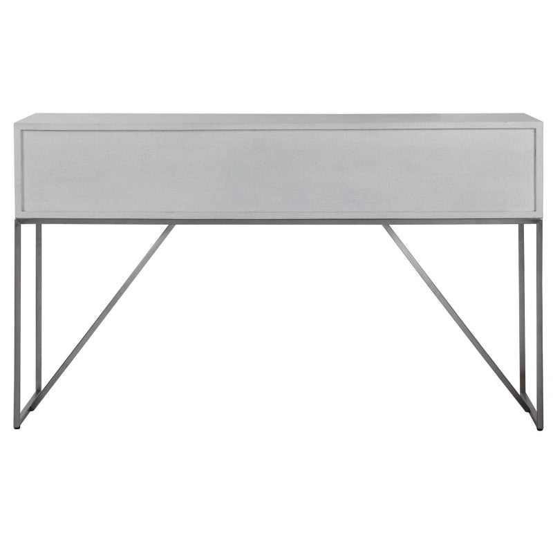 Clean Contemporary Styling, Featuring Oak Veneer Finished In A Soft White With Light Gray Distressing. Accented With Statement Hardware In Brushed Nickel Stainless Steel With A Coordinating Base. Has Two Double Drawers And One Single Drawer In The Center.
