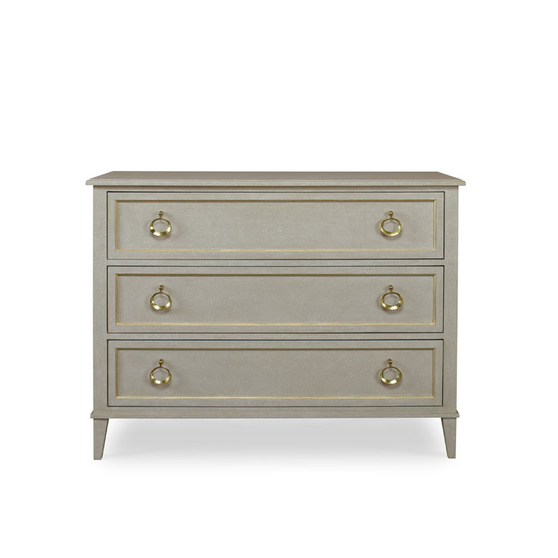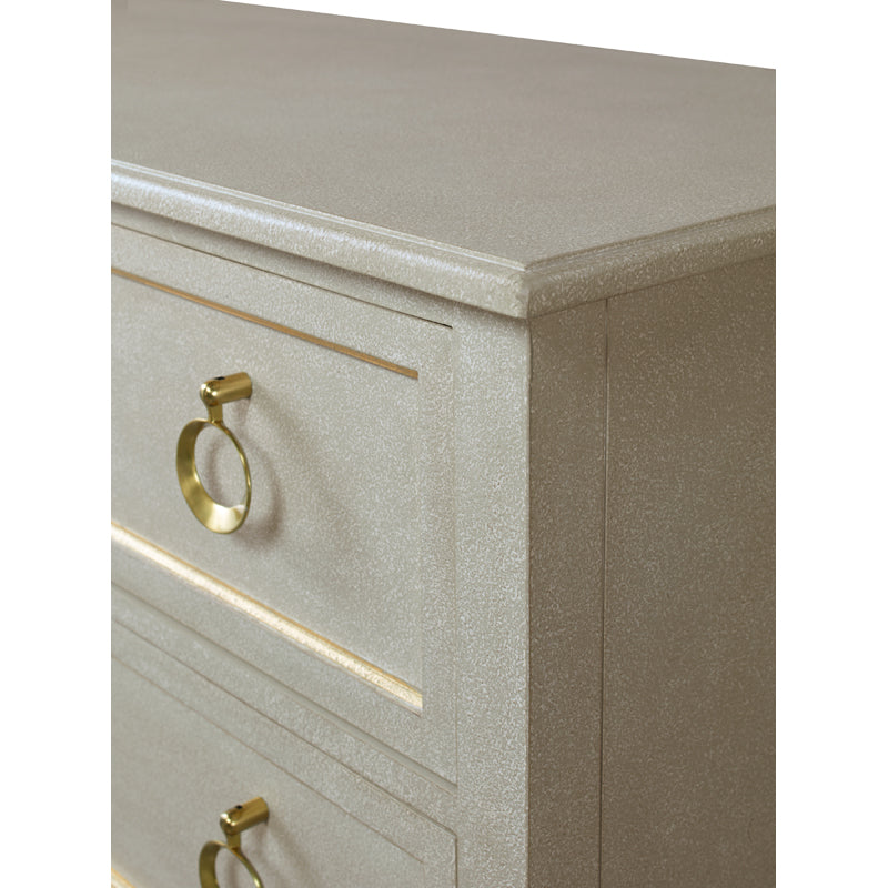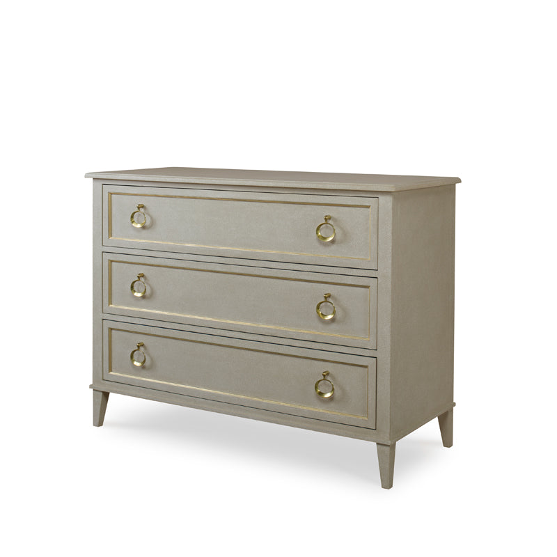 Finished in a textured grey paint with gold leaf accent trim around drawer fronts. Three soft-close drawers with brass ring pulls