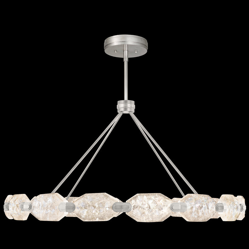 State of the art LED pendant in platinized silver leaf finish, created by acclaimed interior designer Allison Paladino incorporates our exclusive studio process of dichroic rough-cut sculpted glass. Each gem is lit by hidden LED highlighting a subtle dual-colored reflective brilliance. Also available in gold leaf and patinated bronze.