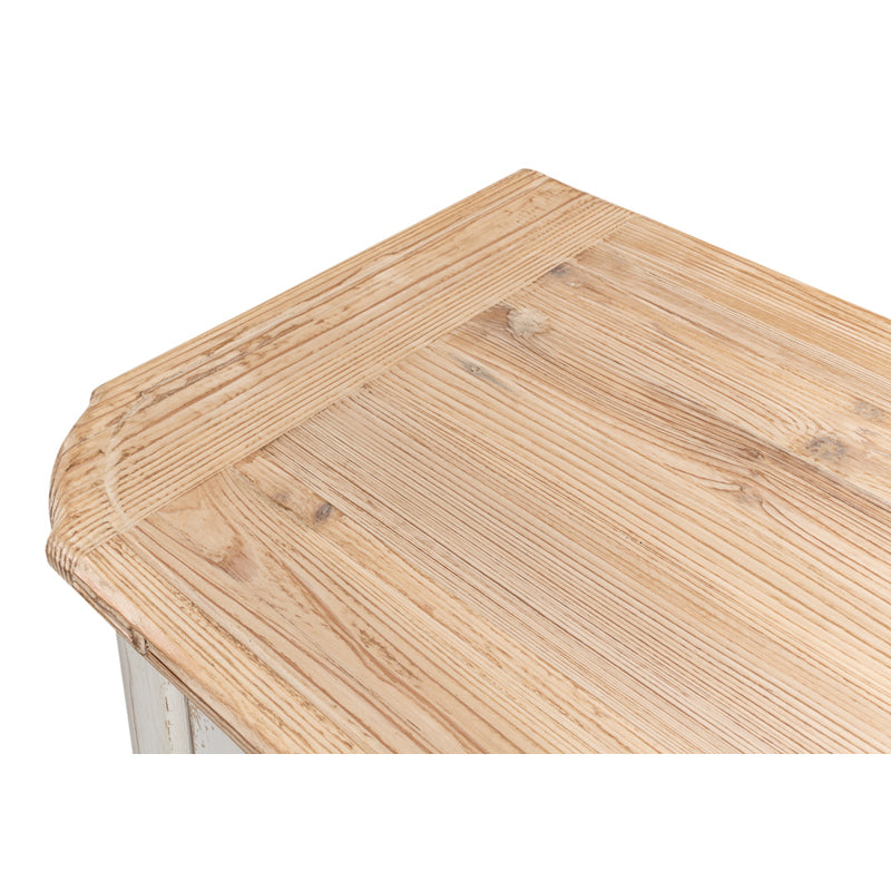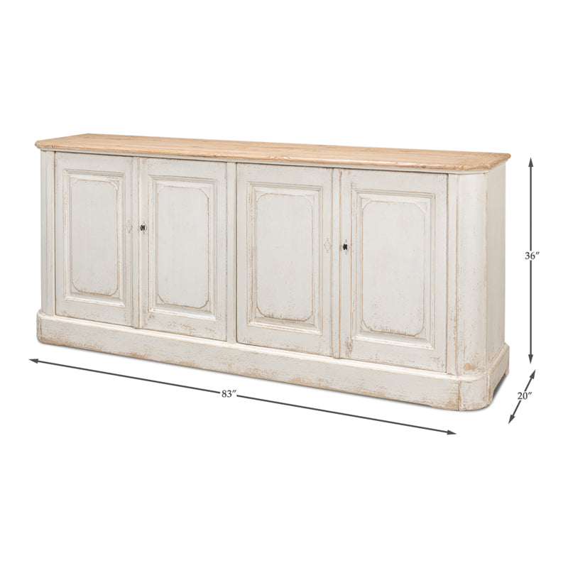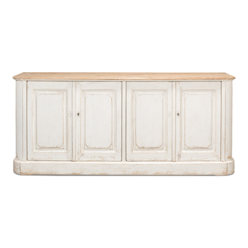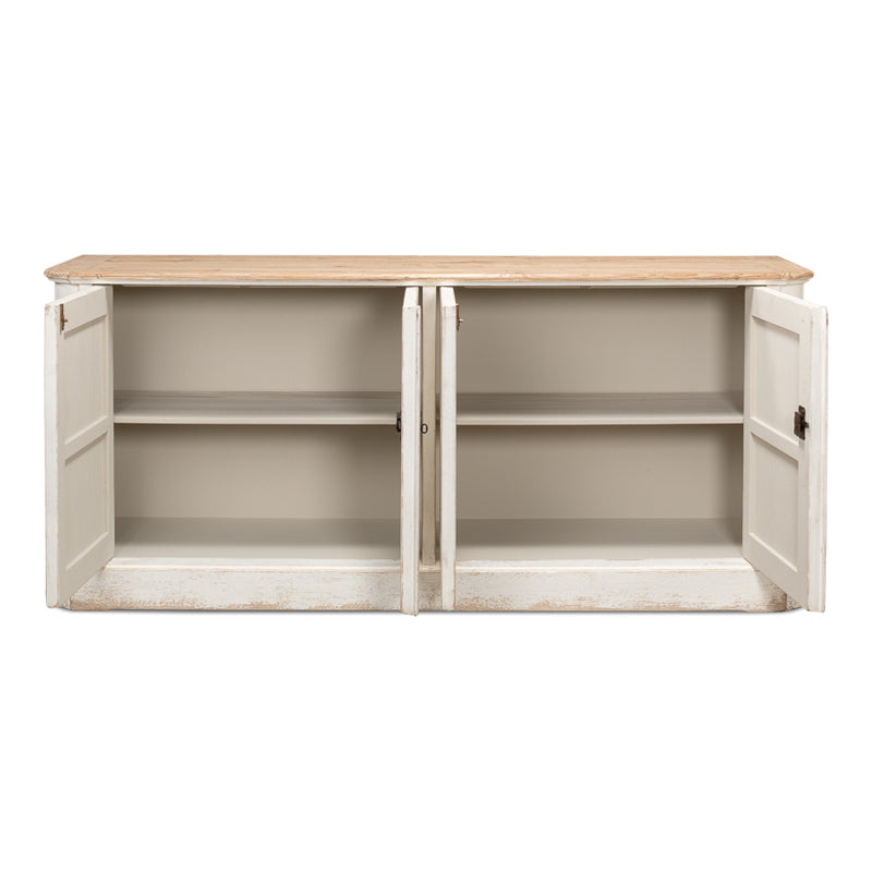This wonderful sideboard is made of reclaimed pine. The interior shelves are removable. We show a nice combination of a painted base and a natural pine top. Four doors.