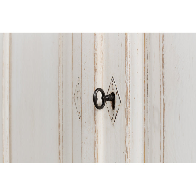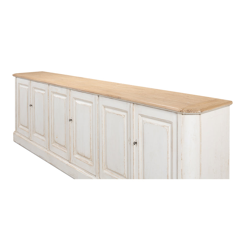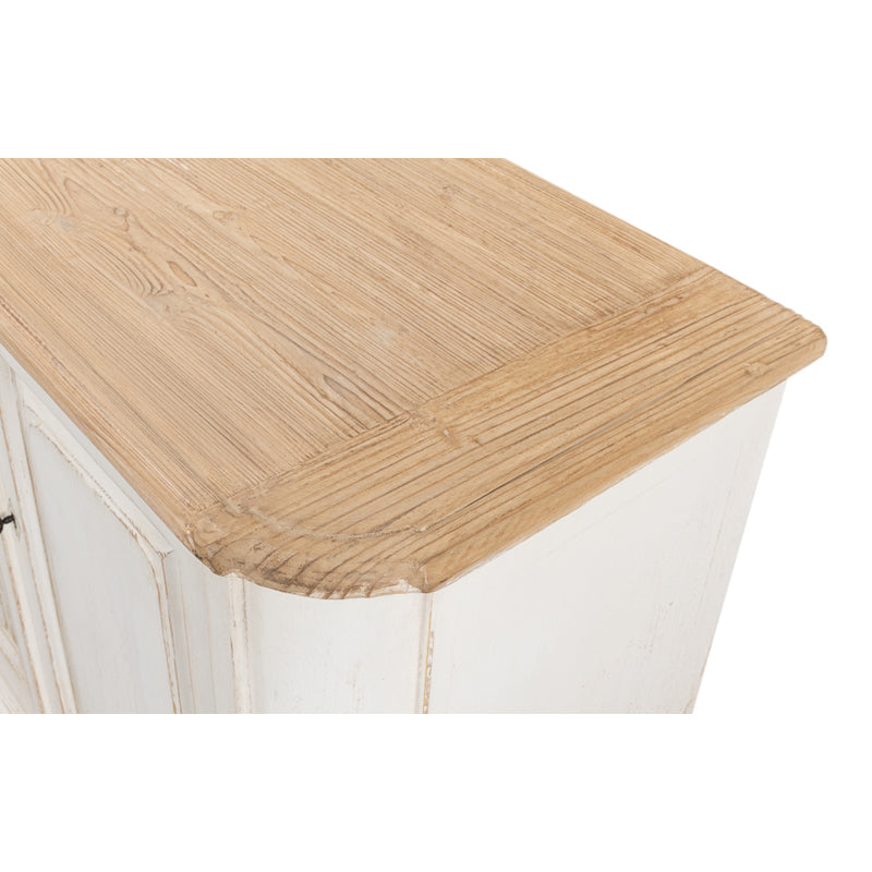 This wonderful sideboard is composed of reclaimed pine. The interior shelves are removable. We show a nice combination of a painted base and a natural pine top. Six doors.