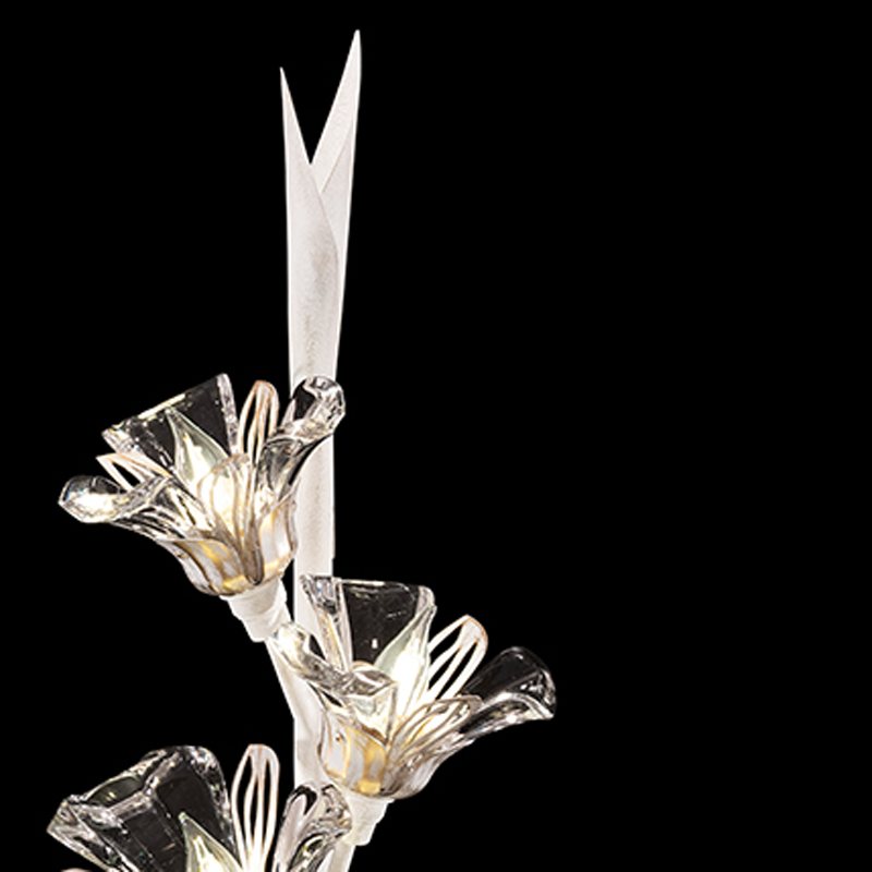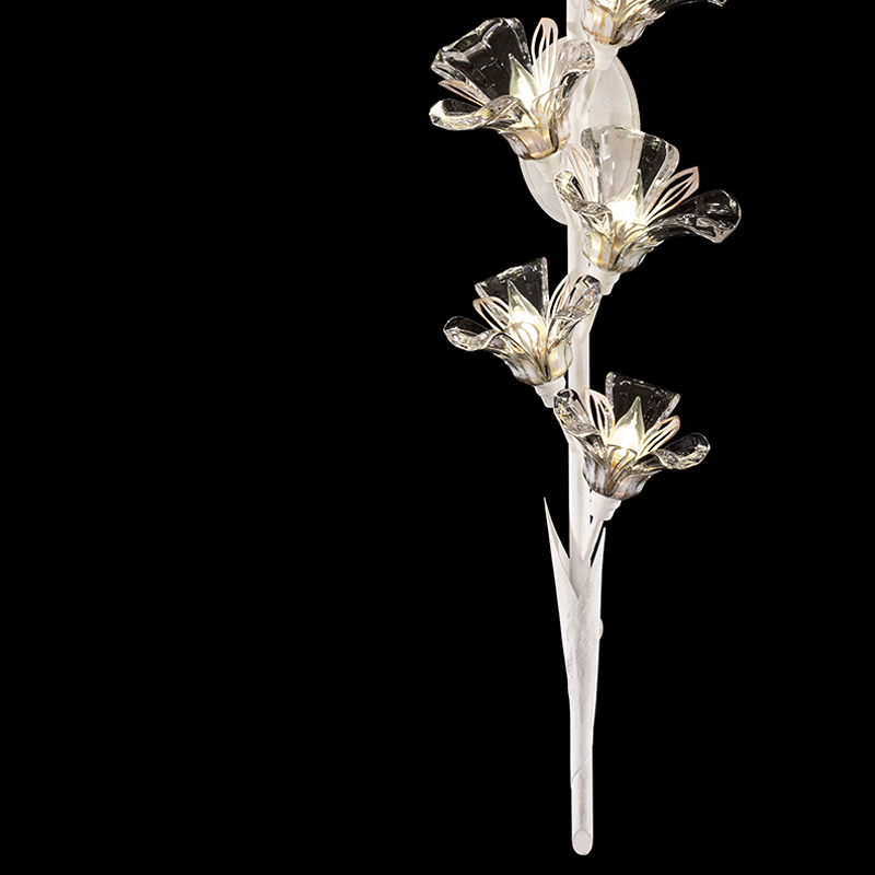 This collection is inspired by the craftsmanship of fine jewelry, runway fashion trends, and the beauty of nature itself. Its name is short for Azucena, a "Madonna Lily" in Spanish. This white gesso sconce features a flirtatious interplay of crystal with white and gold brushed metal floral adornments creates a romantic atmosphere emanating feelings of joy and the celebration of life.