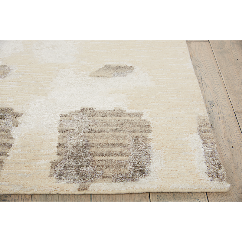 "This asymmetrical sketch was born from a desire to recreate a disheveled carpet of water-reeds, which turned out amazing. " - Christopher Guy Light natural ones with shades of gray create a broad woven effect in this bold patterned rug of wool, linen, silk and bamboo. Also available in square shape (47-0046) and round shape (47-0047).
