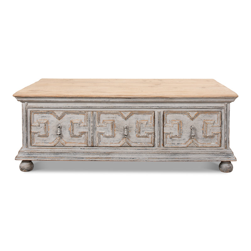 Boasting two deep drawers on each side, this coffee table is a pleasant addition to our Shoreline Collection. It is made of old Pine and given an Antiqued Swedish Gray finish. The top is left natural and the combination of finishes is quite nice.