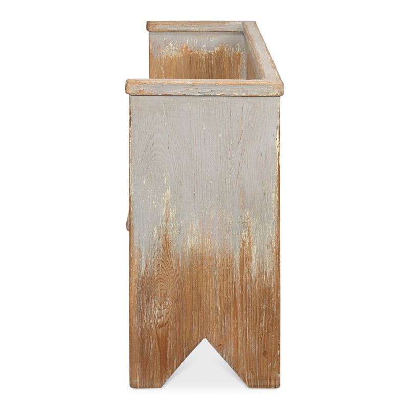Put this friendly looking bench in the kitchen for convenience or as dining seating. By the back door will work too. Distressed painted finish.