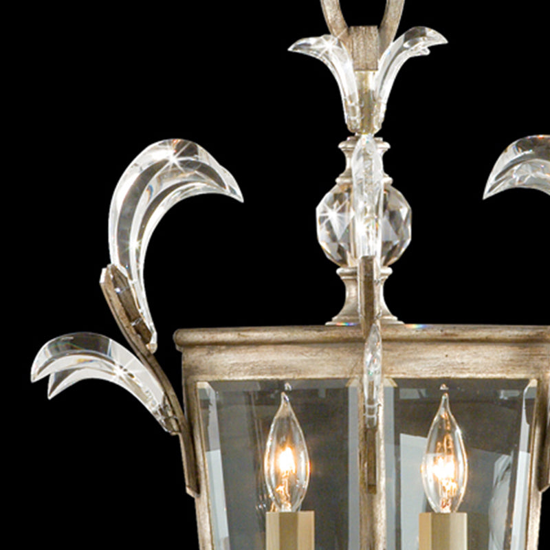 Lantern in warm muted silver leaf finish. Features beveled crystal accents.