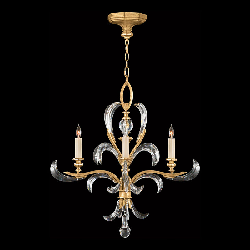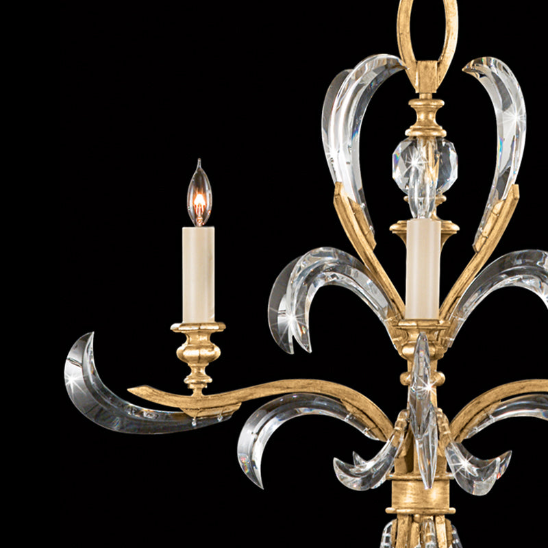 Chandelier in a warm muted gold leaf finish featuring beveled crystal accents.