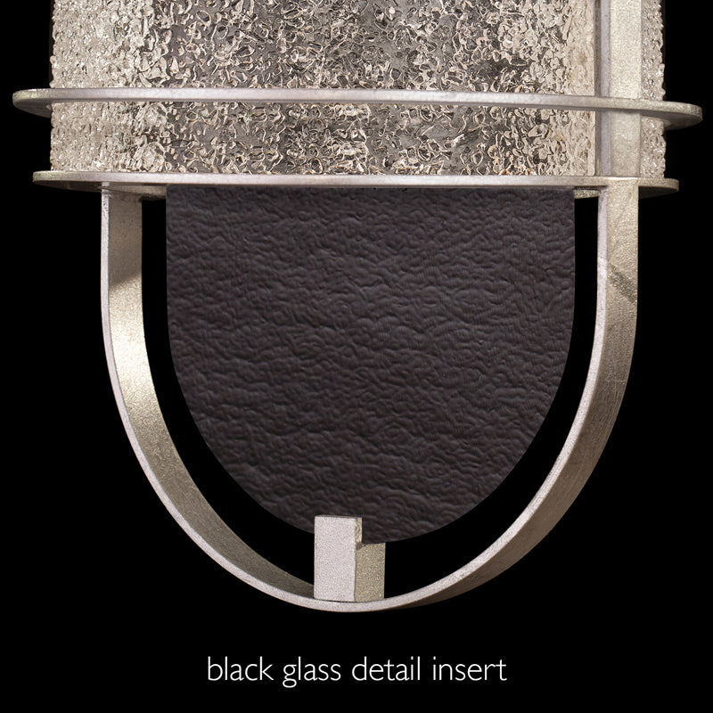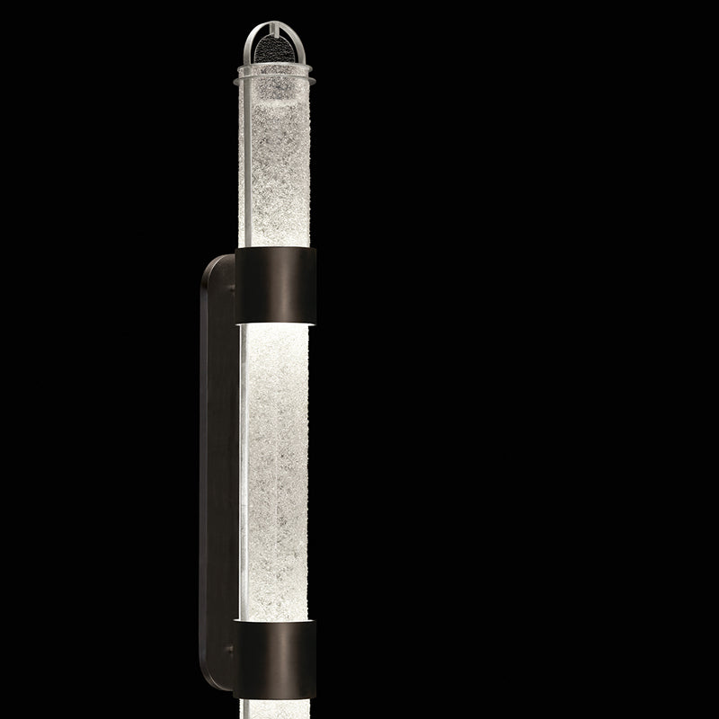 LED sconce featuring illuminated cylinders formed by handcrafted glass set within a silhouette, beautifully lit from within, spanning space vertically or horizontally. Shown in our standard Black and Silver Leaf finish with “Diamond Blanket” naturally faceted crystal frit glass, thermally induced to an exact heat, creating a blanket of sparkling crystal. Can be mounted vertically or horizontally.