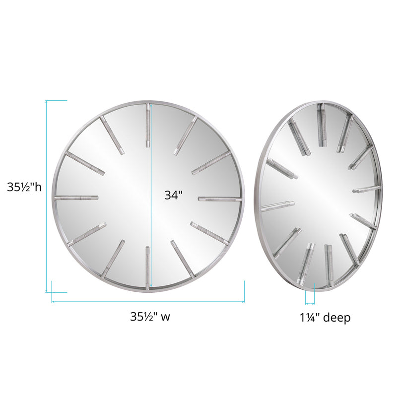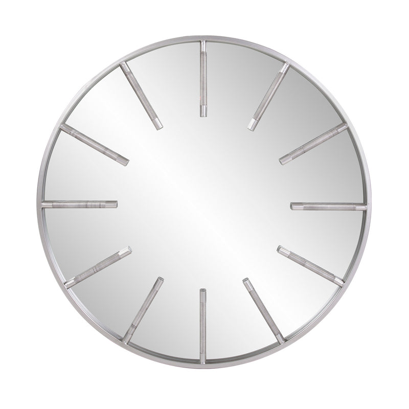One of the characteristics of an Industrial styled mirror is the unique use of materials that make up its design. In this case, the Boulon Mirror uses narrow springs equally spaced around a round iron frame to define its look. A bright silver finish highlights the industrial look. Keyhole attachments are affixed to the back of the mirror so it is ready to hang right out of the box! Mirror