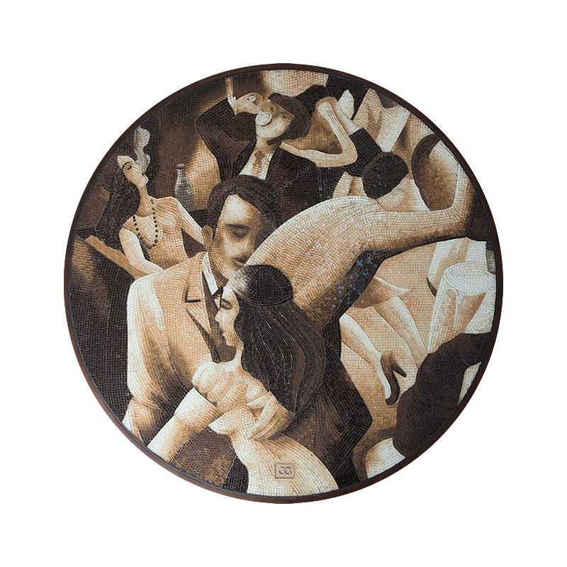 Inspired by the stylized figurative mid-century works of Chicago painter Archibald John Motley Jr. , this wall art is painstakingly hand made with thousands of ultra fine hand cut and colored mosaics. A truly exceptional artwork.