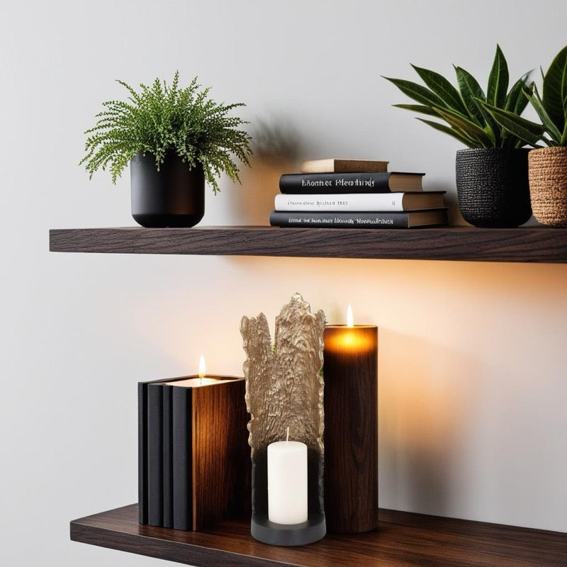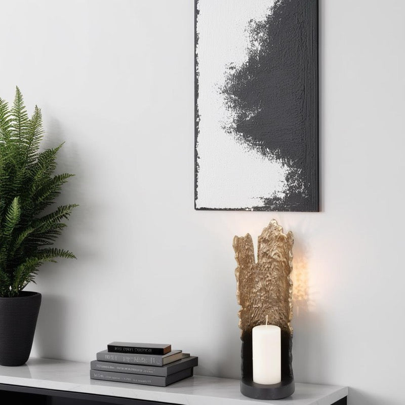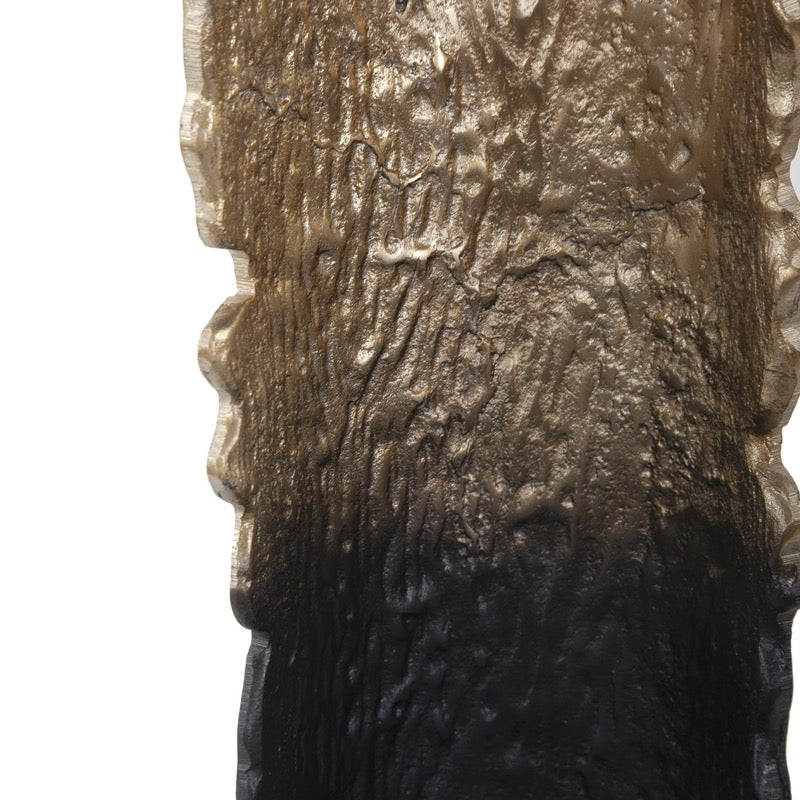 Faux bois is the French phrase that refers to the artistic imitation of wood or wood grains in various media. In this case we created the Situ candleholder with its textured bowed back resembling the bark of a tree. These holders are cast in aluminum and finished in an ombre' effect from black to rustic gold. The soft glow that will be created as light reflects off the back of the holder will add just the right ambience to any occasion. Candleholder