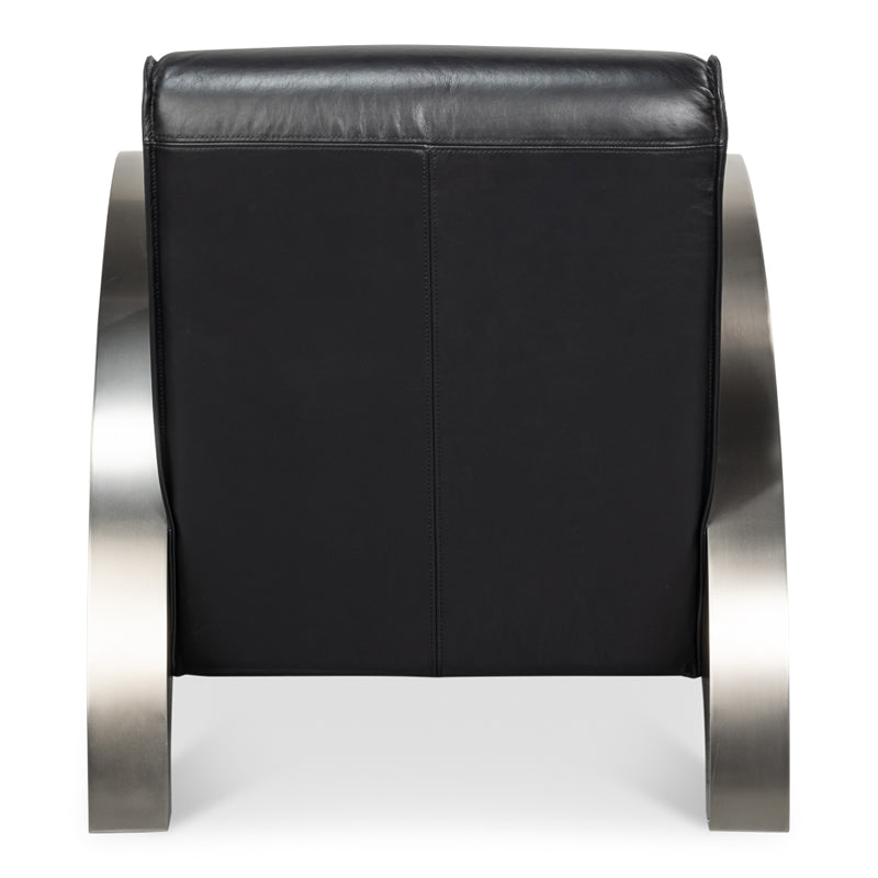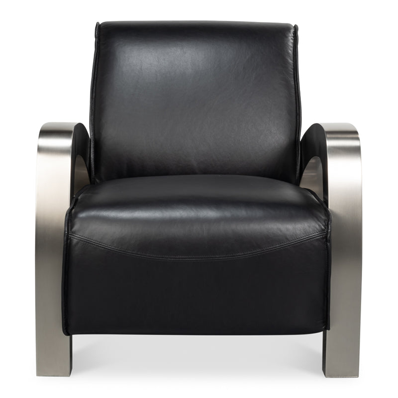 Lounge in absolute comfort and style with the Carlisle modern armchair, seamlessly blending supple top grain leather with stylized brushed stainless arms and base, creating a captivating juxtaposition of luxury and contemporary flair.