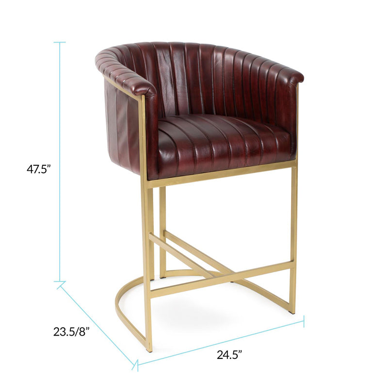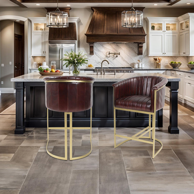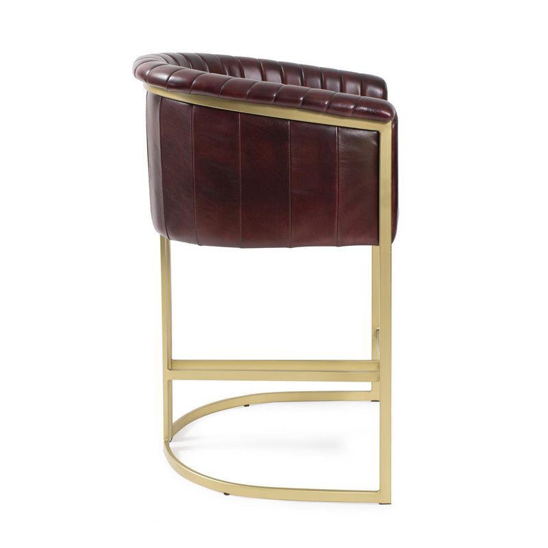 The Iris Leather Chair is a barrel-style chair featuring a rich leather seat and sleek matte gold legs. Enhanced with stitching details, creating a dynamic look reminiscent of elegant lines running down the seat. Chair