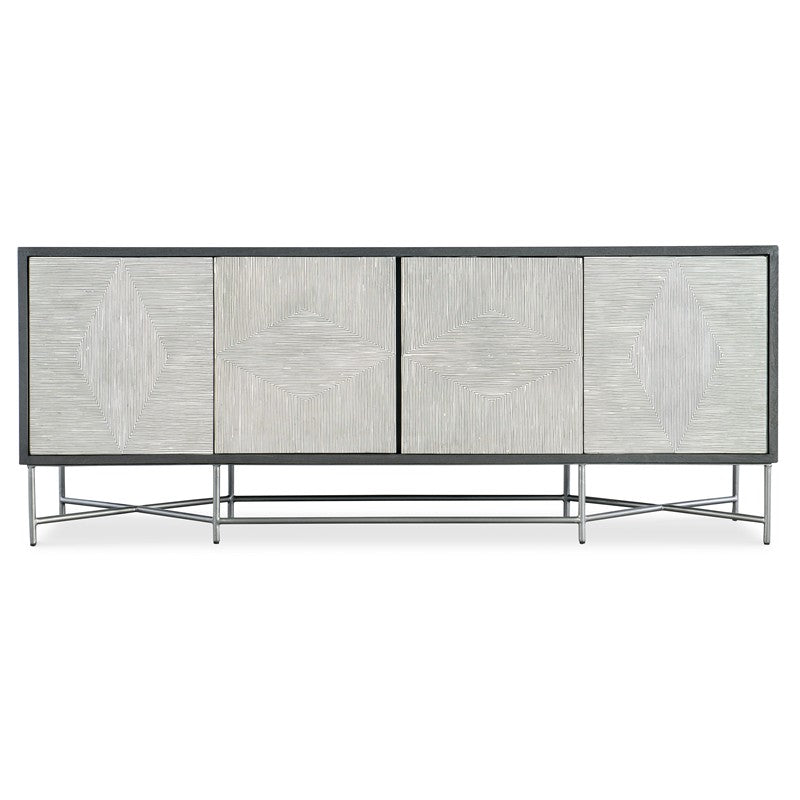 Cool, calm and chic, the Fine Lines Credenza is crafted of Mango Solids in a natural black wood finish with a brushed pewter metal base. On the door fronts is a black and white bone design in a diamond motif. The 4 doors have soft-close hinges and touch latches, and the interior finish matches the outside of the case. There’s one removable shelf behind each pair of doors. A ventilated back panel and wire management make the credenza media-friendly.