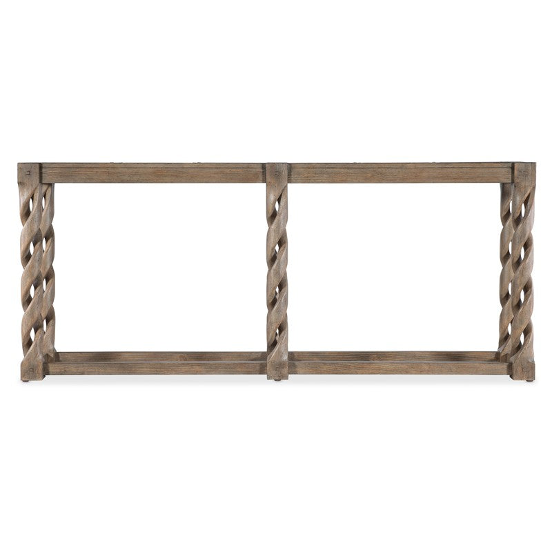 Exuding craftsmanship with attention to detail, the casual Jack O’Bein Console Table has twisted legs and a paned veneer top with peg accents. Crafted of Pine Veneers, it has a medium wood finish. At 78 inches wide and only 14 inches deep, it fits into narrow spaces beautifully.
